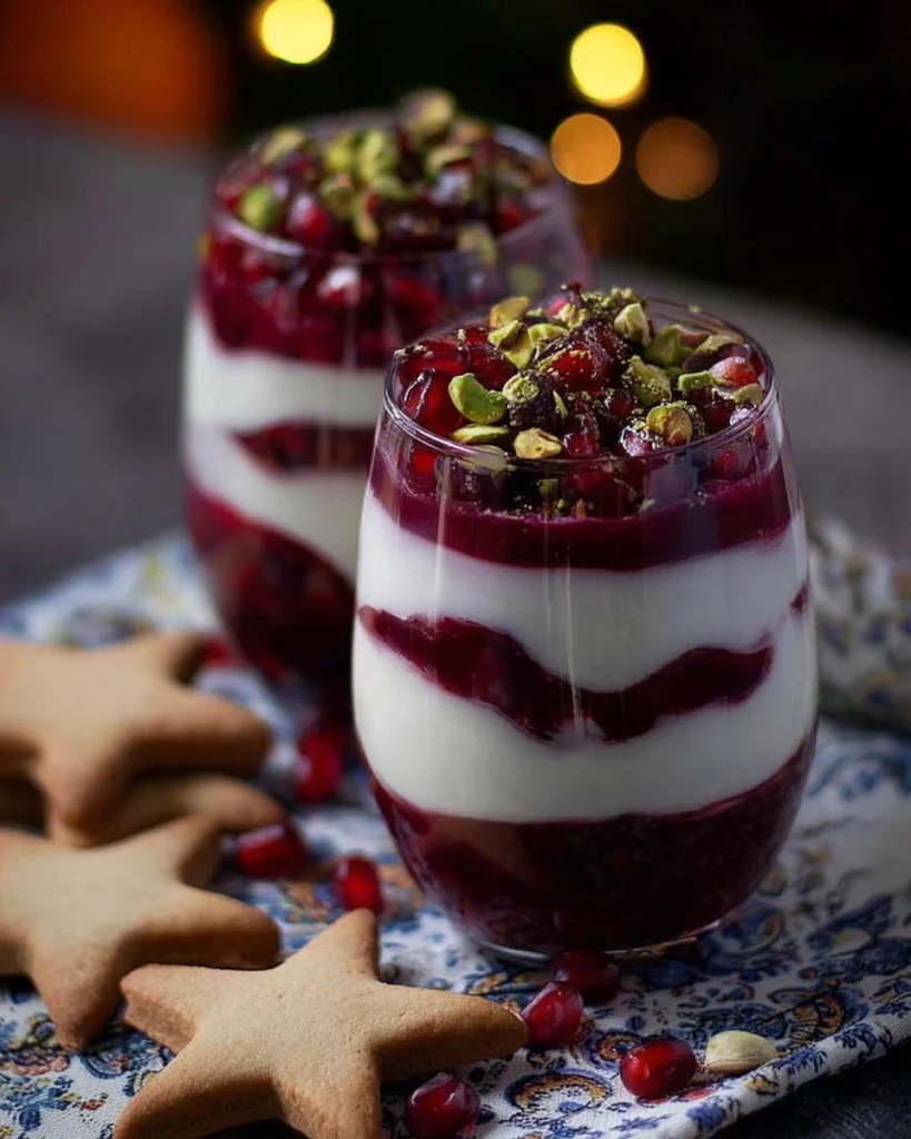 Before serving, finish by topping each parfait with chopped pistachios and a sprinkle of edible dried rose petals. For a festive touch, add a cinnamon star or cookie on the side. This last bit turns the simple parfait into a showstopper!