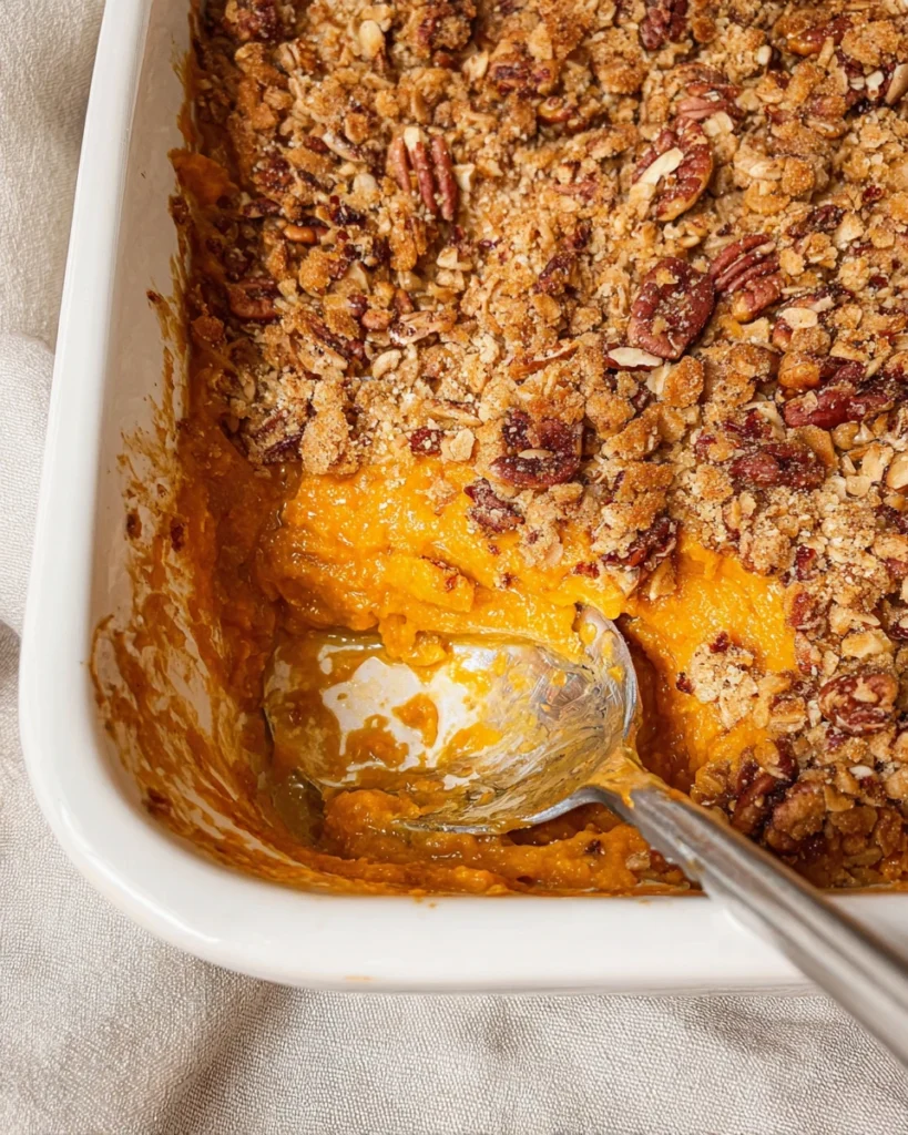 Now comes the fun part! Spoon the sweet potato mixture into the prepared casserole dish. Then, evenly sprinkle the brown sugar and pecan topping over it. This creates an exciting visual contrast.